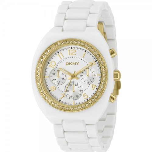 With a hint of girlish charm, she'll adore this feminine DKNY watch style. Creating a trendy look, the round white three-eye chronograph dial and crystal bezel are accompanied by a white plastic band with deployment clasp. It is water resistant to 50 meters (165 feet)and comes with a two-year limited warranty.